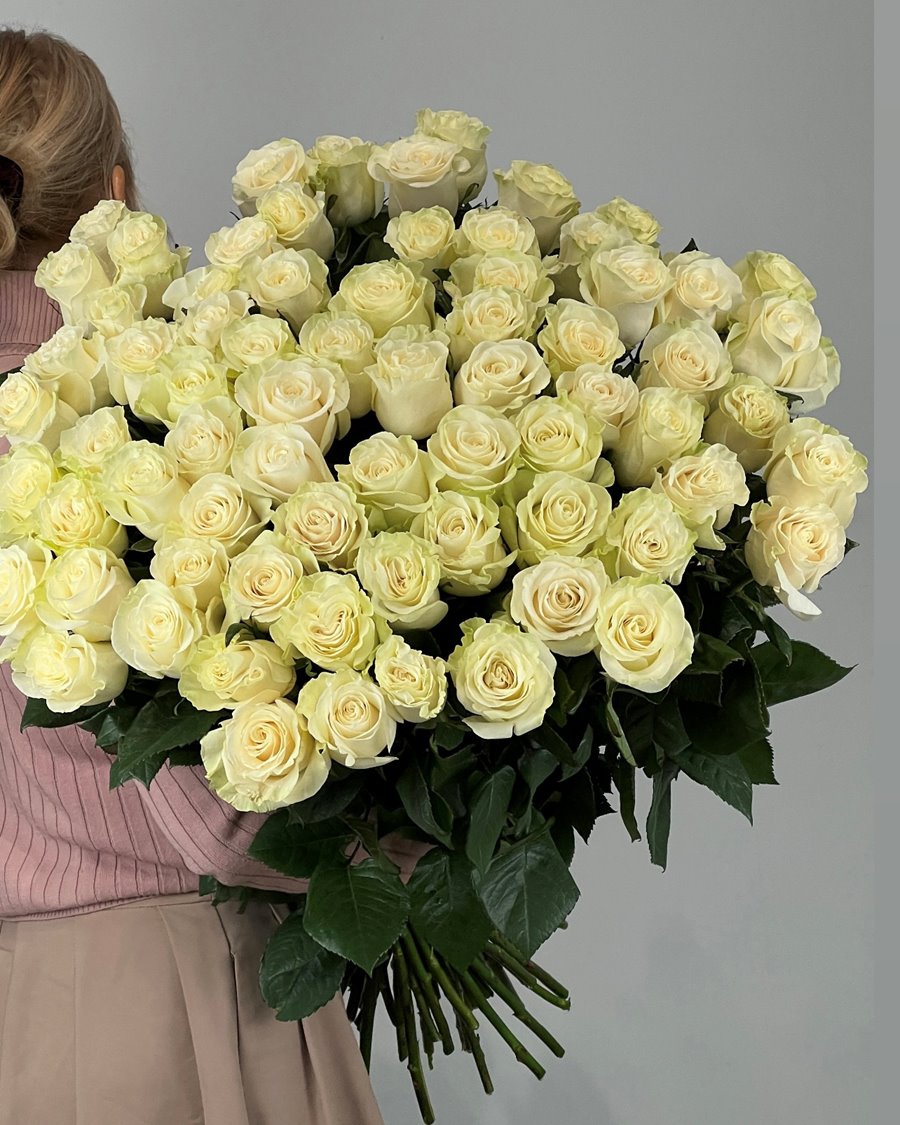 75 белых роз Мондиаль Эквадор 80 см -18500 руб.