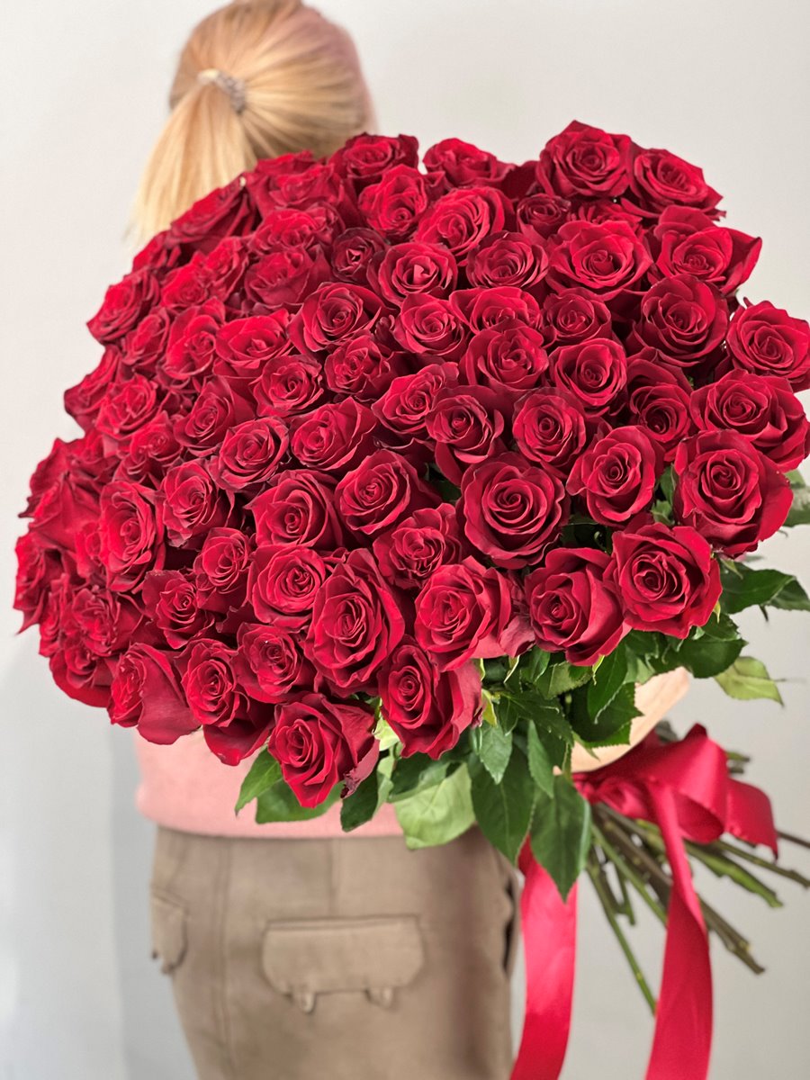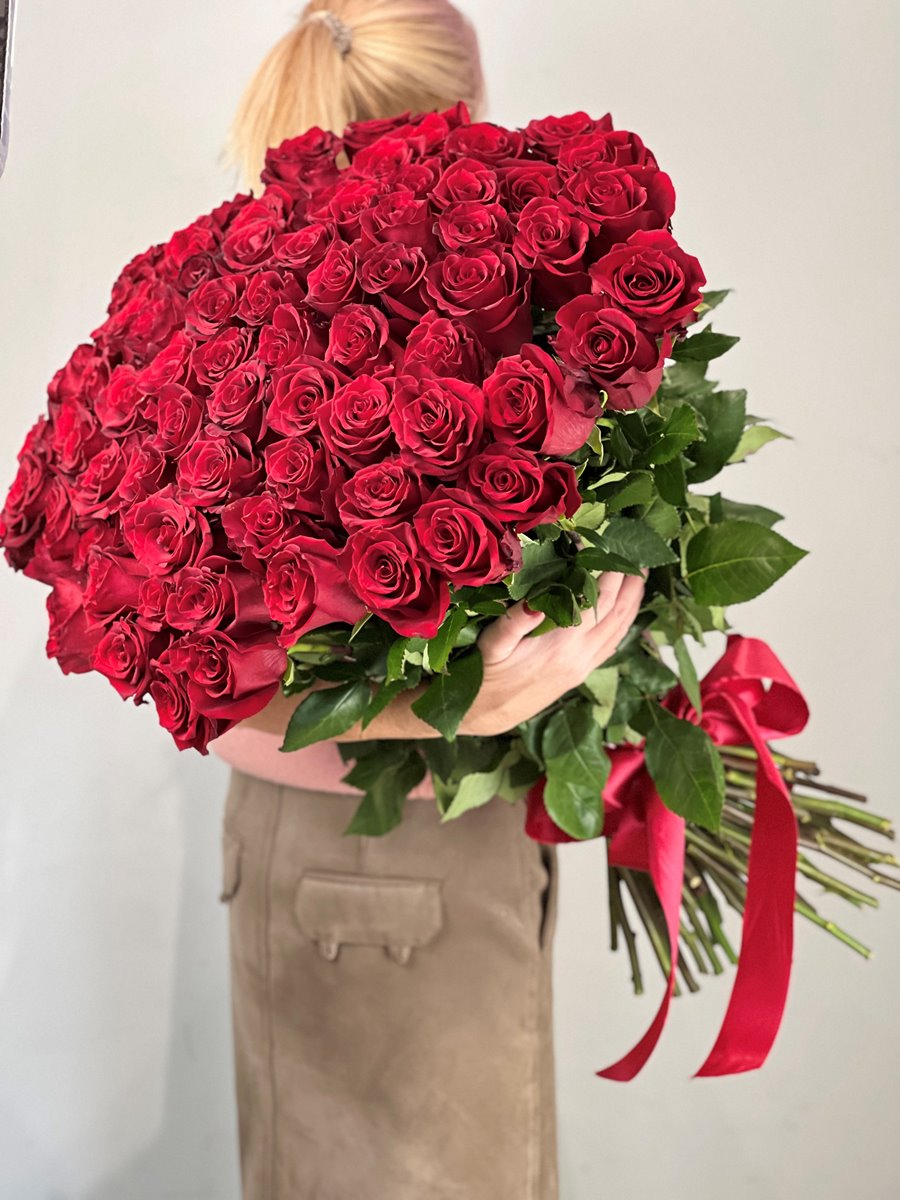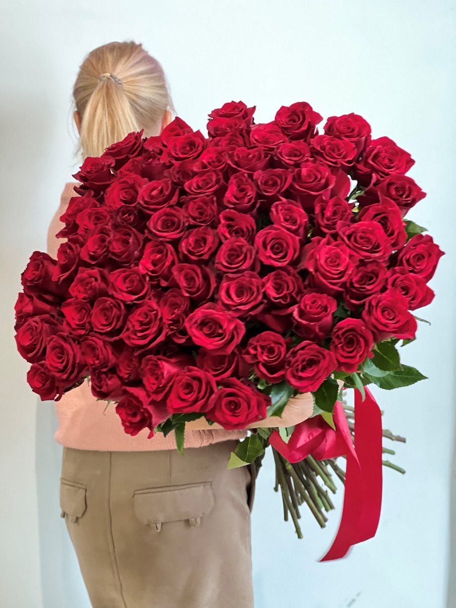 Посмотрите, как выглядит букет из 75 красных роз Explorer 80 см в реальности