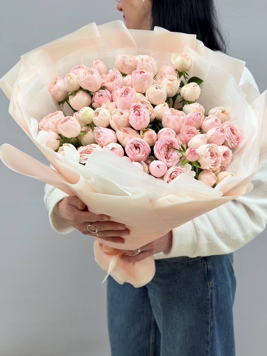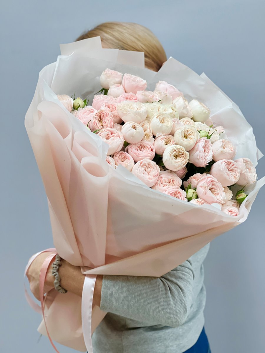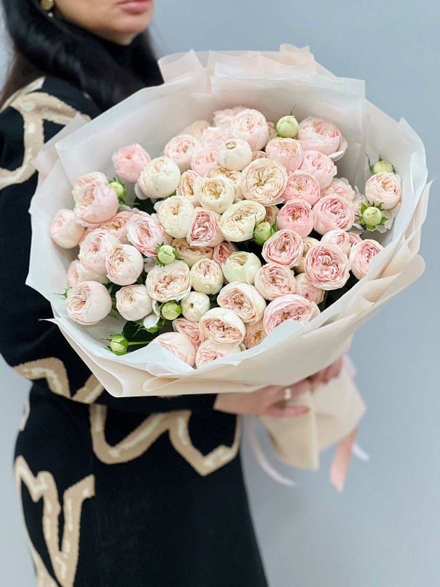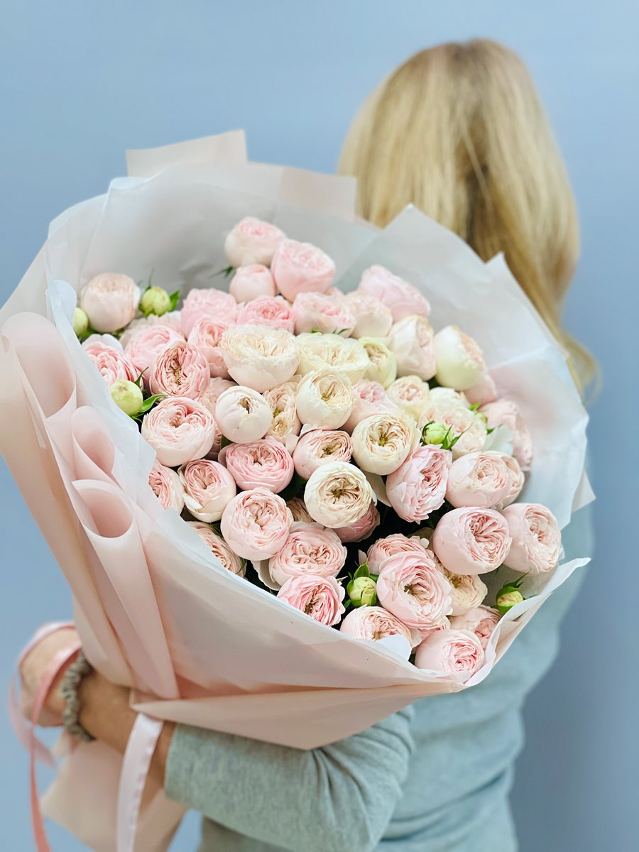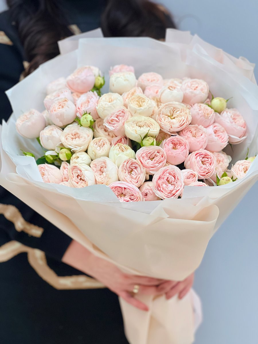 Букет из 17 пионовидных кустовых роз Мэнсфилд Парк — это воплощение нежности и элегантности. Эти розы славятся своими пышными, многослойными бутонами, напоминающими цветущие пионы. Нежно-розовый пастельный оттенок придает букету особую романтичность и утонченность.