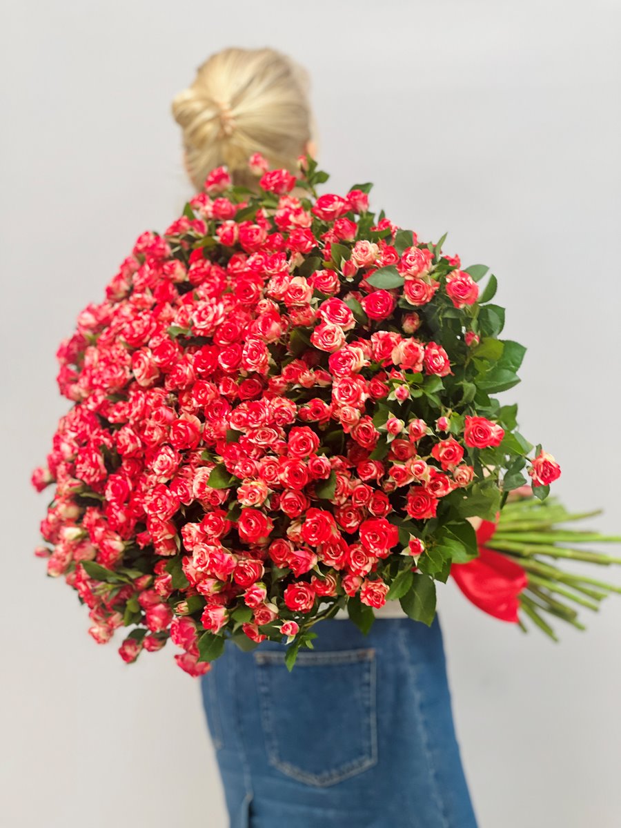 Букет «Фейерверк эмоций» — это настоящий взрыв красок и чувств! 51 кустовая роза сорта Fireworks («Фейерверк») создает невероятно объемный и жизнерадостный образ. Этот сорт знаменит своим уникальным окрасом: каждый малиново-красный бутон украшен изящными белыми штрихами и вкраплениями, словно искры праздничного салюта. Такой букет невозможно не заметить — он дарит ощущение праздника, энергии и безграничной радости.