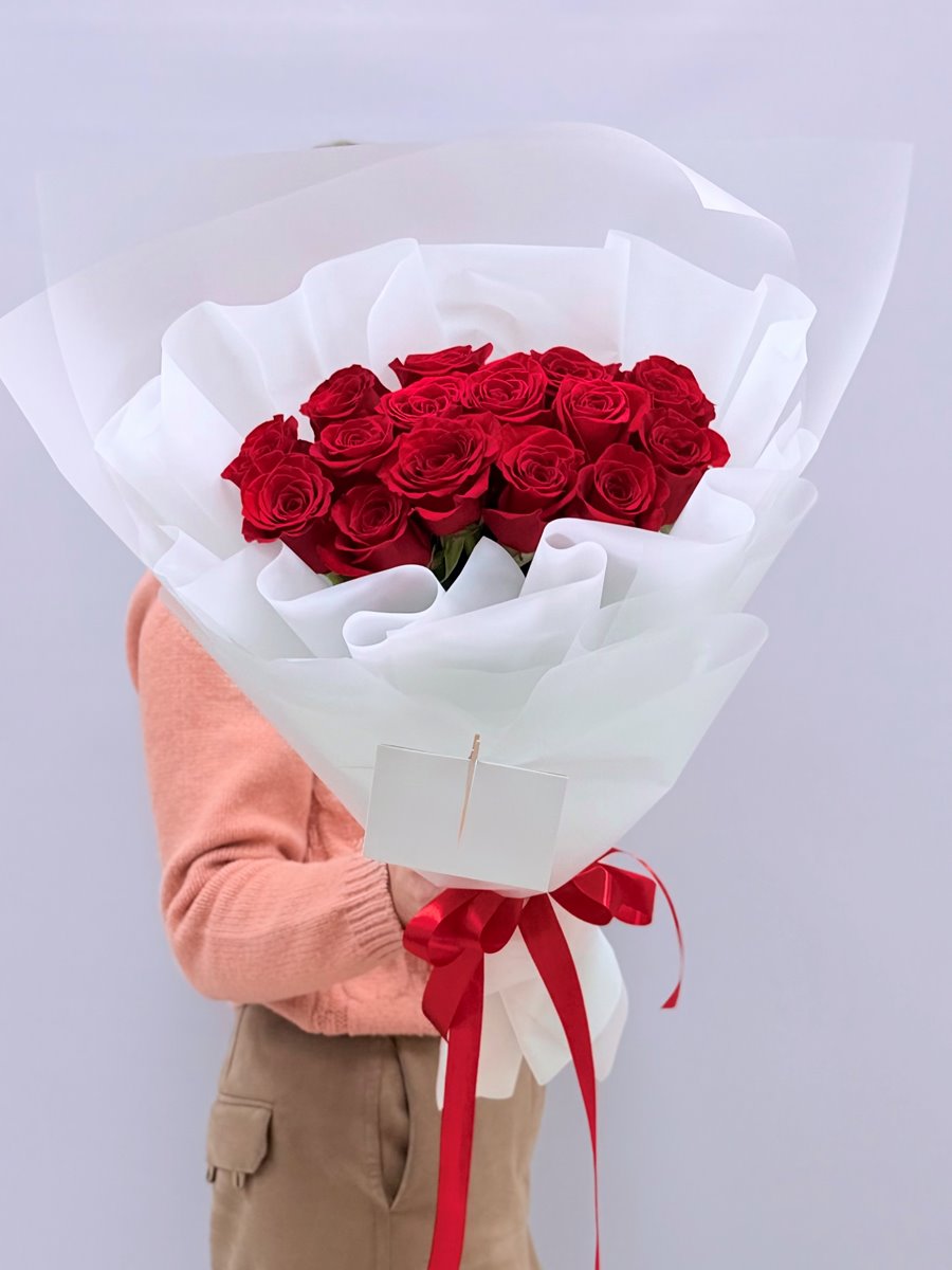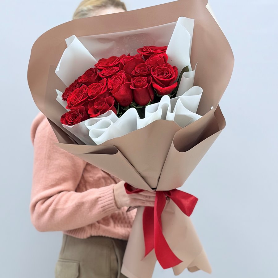 - 15 красных роз сорта Freedom (длина стебля 50–60 см)