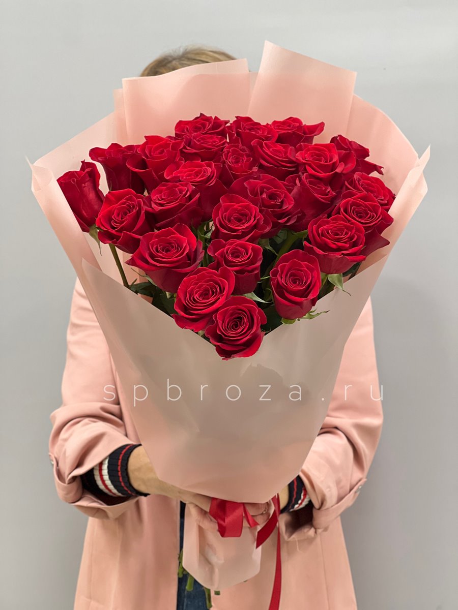 25 алых роз Freedom Эквадор в дизайнерской упаковке