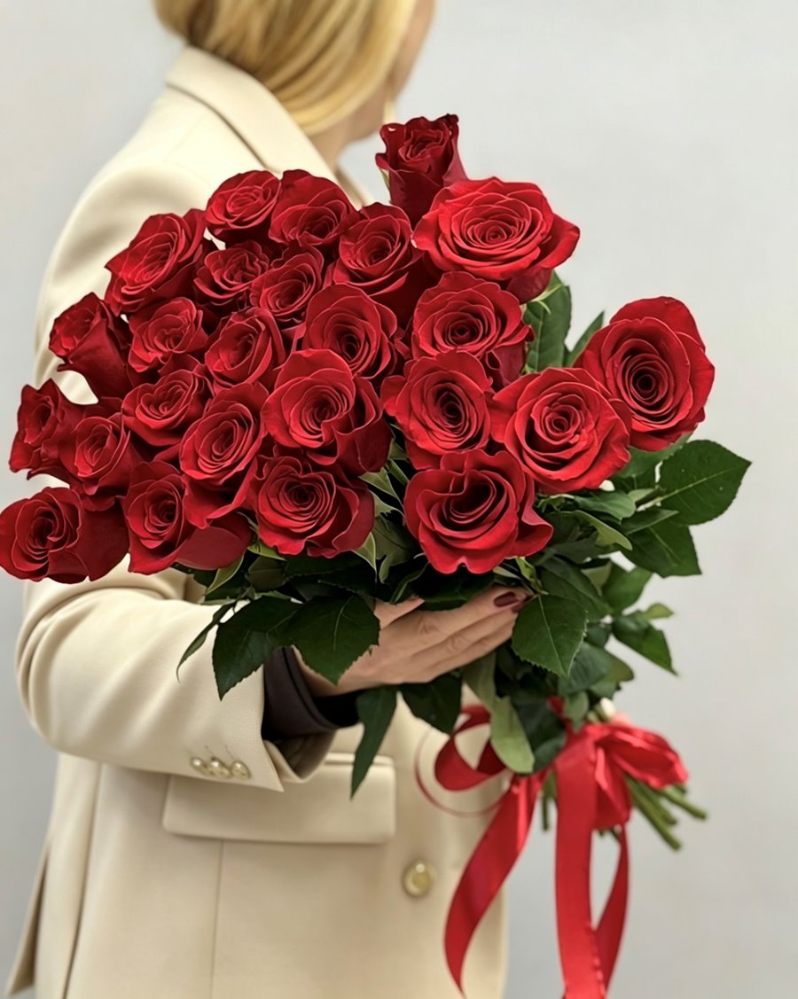 25 красных роз Эквадор 60 см под атласную ленту