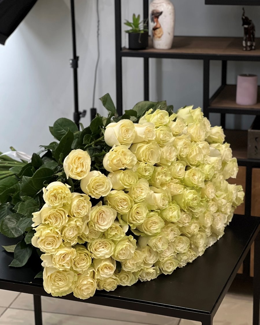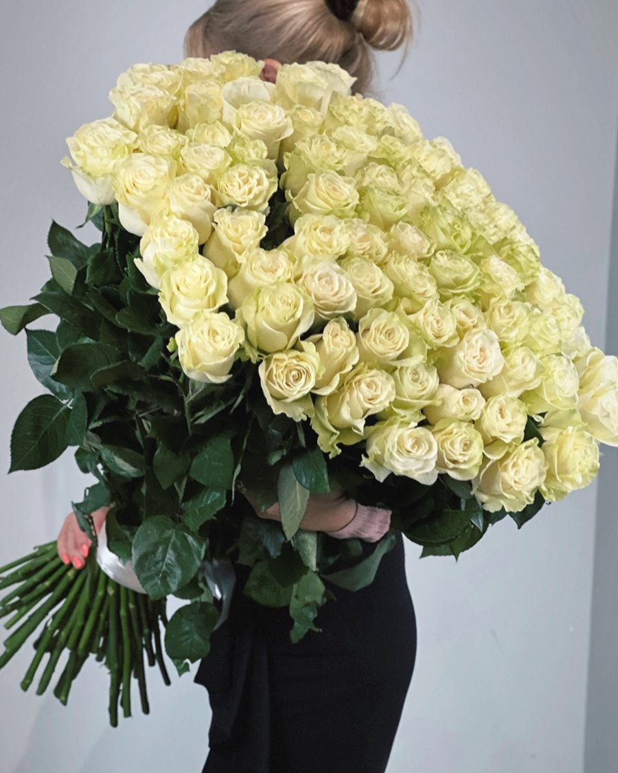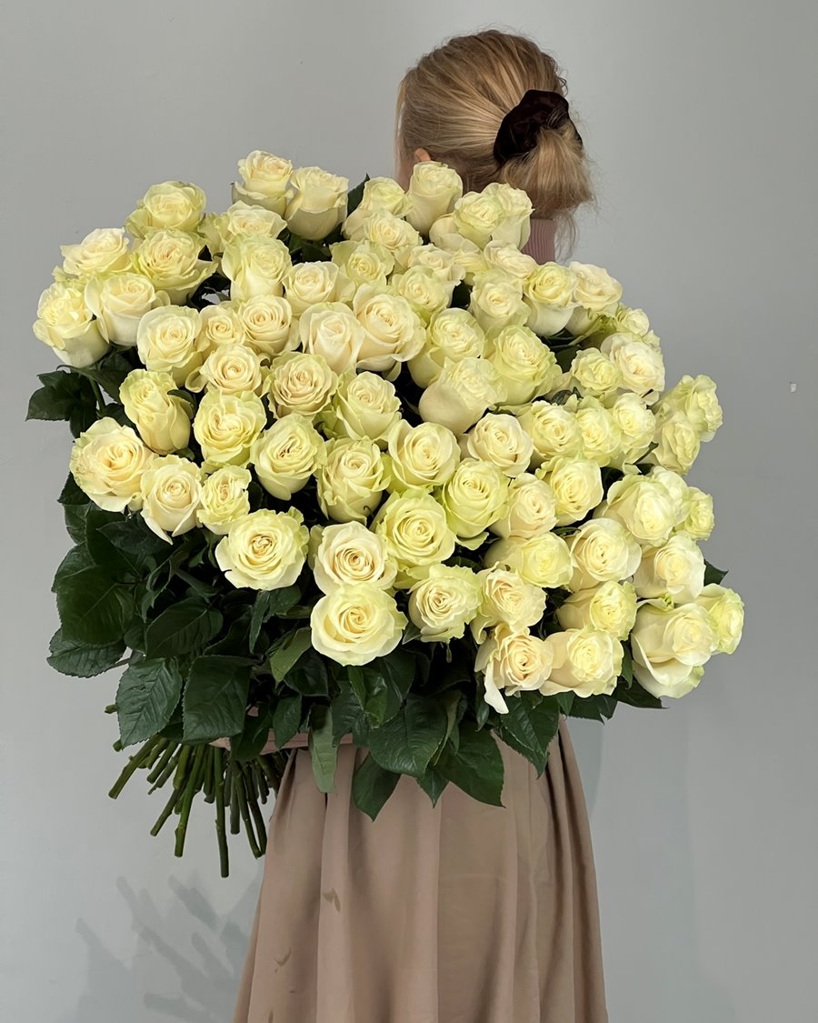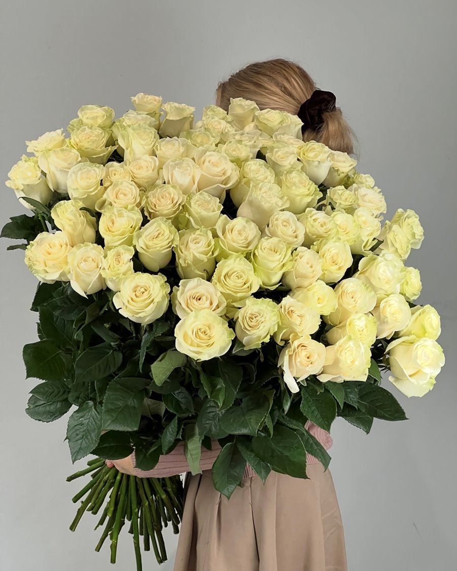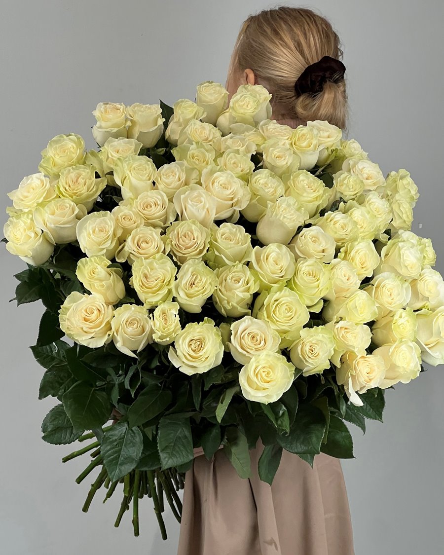 Вы выбрали один из самых элегантных и востребованных вариантов для подарка — композицию из 75 белых роз премиум-сорта «Мондиаль» из Эквадора.