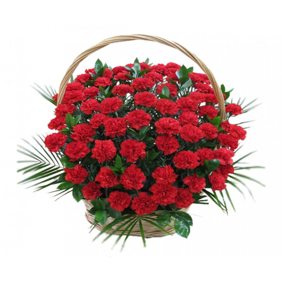 Ритуальная корзина из 75 гвоздик с зеленью на похороны.